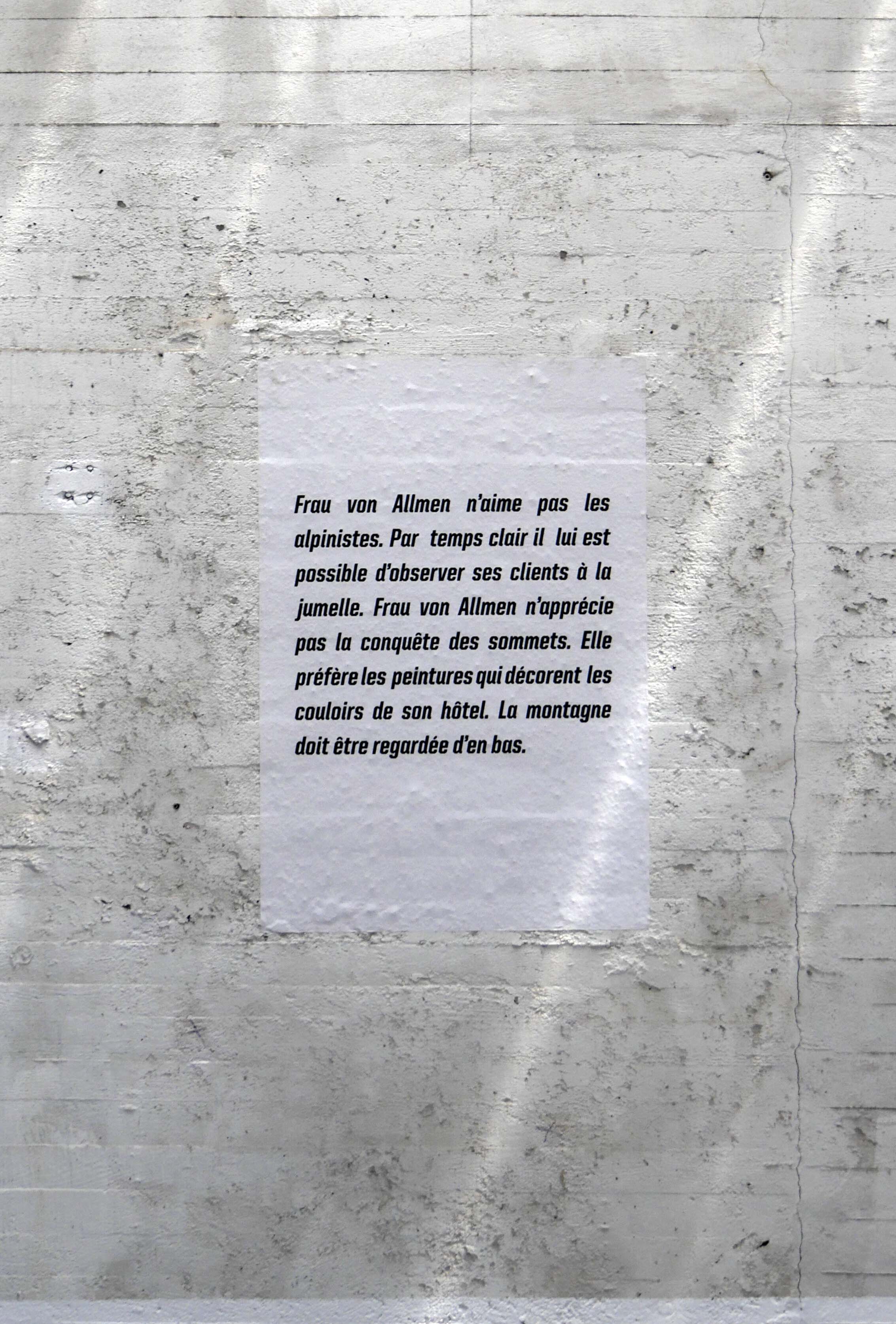 Frau von Allmen est un personnage extrait de l’autobiographie de l’alpiniste française Catherine Destivelle. Frau von Allmen fait le portait d’un personnage secondaire, à la manière d’un spin-off. C’est une histoire de point de vue.