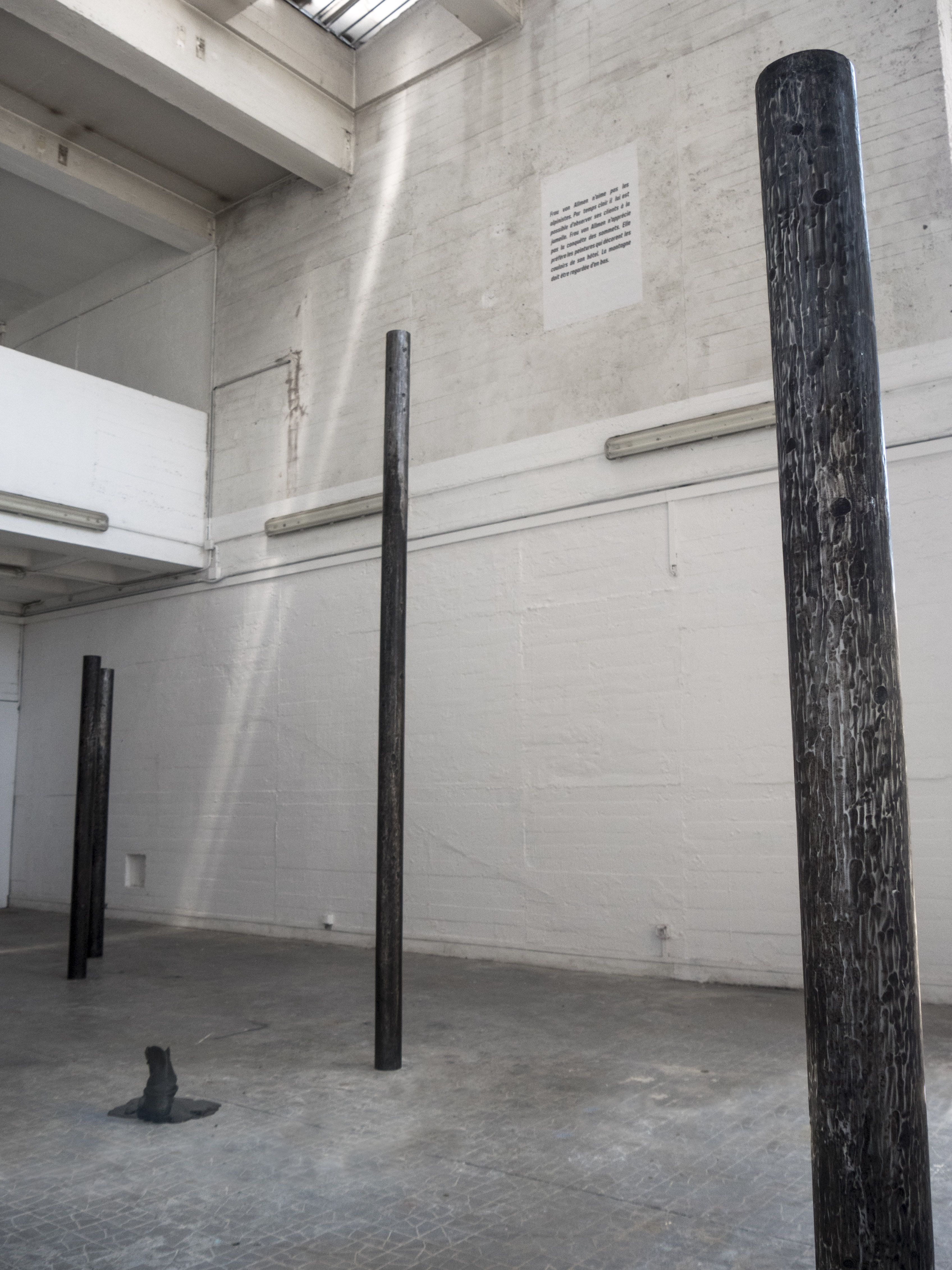 Texte sur papier marouflé, poteaux métalliques, cirage